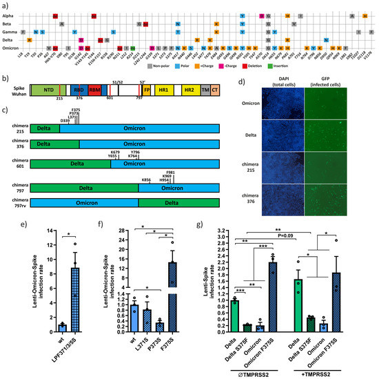 The abundance of mutations within the Spike protein of Omicron exceeds all previous VOCs (Figure 1a,b) [14,15]. The Omicron Spike’s mutational burden downregulates infectivity and fusogenicity [6,7,23,25] and yet is widely spread. We generated Delta–Omicron chimera constructs to investigate the role of the unique Omicron mutations (Figure 1c). To avoid the generation of new gain-of-function SARS-CoV-2 variants, we used the surrogate SARS-CoV-2 pseudovirus (lenti-Spike)-expressing GFP to follow infection. We transduced HEK293T cells expressing the viral receptor HEK293T-hACE2, as previously described [27]. We constructed the 215 and 376 chimeras, where the equivalent Delta Spike regions replaced the 215 or 376 N-terminal regions of the Omicron Spike (Figure 1c). Increased lenti-Spike infection was observed with the 376-Delta–Omicron Spike chimera, compared to both Omicron and 215-Delta–Omicron chimera (Figure 1d). Within the 215–376 Spike region, there were three non-polar Omicron unique residues in close proximity: L371, P373 and F375. To examine the importance of these residues, we constructed an Omicron-Spike-LPF371/3/5S mutant bearing the equivalent Delta sequence (L371S, P373S and F375S). Omicron-Spike-LPF371/3/5S pseudovirus was about eight times more infectious (Figure 1e), suggesting that these residues downregulate Omicron’s infectivity. Afterwards, we mutagenized these residues one by one and found that the F375S mutation increased the infection rate (Figure 1f). The Omicron F375 residue, therefore, might be responsible for Omicron decreased infectivity. To verify this point, we conducted a reciprocal experiment by generating a Delta Spike S375F mutant. This Delta mutant inefficiently infected cells (Figure 1g). Thus, the unique Omicron Spike F375 residue might be the reason for the low Omicron infectivity in tissue culture.