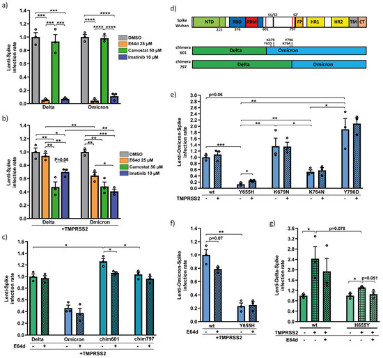 The Omicron Y655 residue increases infection rate and reduces TMPRSS2 dependency. (a) SARS-CoV-2 entry inhibitors have similar effects against lenti-Delta- and lenti-Omicron-Spike in TMPRSS2-negative cells. HEK293T-hACE2 cells were treated with each; DMSO (untreated), E64d, camostat and imatinib, 2 h before infection with either lenti-Delta- or lenti-Omicron-Spike and further treated as described above. Infection rate was calculated by normalizing to DMSO treated cells. (b) Lenti-Omicron-Spike but not Lenti-Delta-Spike infection was inhibited by E64d in TMPRSS2-positive cells. HEK293T-hACE2 cells were transfected with pEFIRES-TMPRSS2 and treated with 1.2 µM puromycin 1.5 d later. Next day, cells were treated as above. (c) Lenti-Spike chimera 797 was not inhibited by E64d in TMPRSS2-positive cells. The indicated different lenti-Spike virions were used to transfect HEK293T-hACE2-TMPRSS2. Cells were treated with E64d and infected with lenti-Spike as described above. Infection rate was calculated by normalizing to untreated Delta. (d) Scheme of the Delta-Omicron-Spike chimeras compared to functional regions of Wuhan Spike with Omicron unique residues highlighted. (e) Lenti-Omicron-Spike Y655H infectivity increases in TMPRSS2-positive cells in comparison to TMPRSS2-negative cells. HEK293T-hACE2 cells were transfected with either pEFIRES or pEFIRES-TMPRSS2 and puromycin treated as above. Infection rate was calculated by normalizing to wt Omicron. (f) E64d treatment is ineffective against lenti-Omicron-Y655H-Spike infection. HEK293T-hACE2-TMPRSS2 cells were generated and treated as described above. (g) Delta H655Y mutant was poorly TMPRSS2 dependent. Cells were treated as described above, and infection rate was calculated by normalizing to untreated TMPRSS2-negative cells. Data were statistically analyzed by student-t-test: * = p ≤ 0.05; ** = p ≤ 0.01; *** = p ≤ 0.001; **** = p ≤ 0.0001.