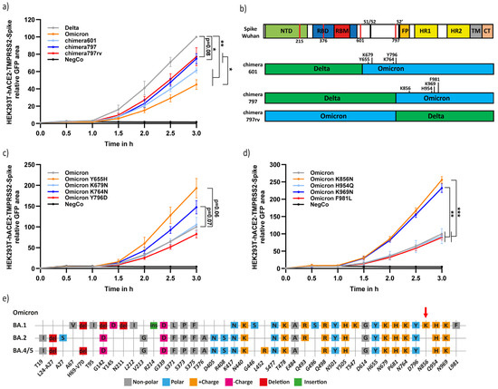 Omicron contains around 50 mutations compared to the initial SARS-CoV-2 strain (Wuhan) with over 30 amino acid (aa) variations in the Spike, the viral surface glycoprotein [14,15]. Although most of the mutations are localized in the Spike’s receptor-binding domain (RBD), angiotensin-converting-enzyme (hACE2) remains Omicron’s cellular receptor with an even higher affinity [15,16,17,18]. SARS-CoV-2 interaction with hACE2 initiates cell entry via receptor-mediated endocytosis or membrane fusion, depending on the absence or presence of transmembrane serine protease 2 (TMPRSS2), respectively [19,20,21]. Omicron can infect cells in a TMPRSS2-independent manner, maximizing the receptor-mediated endocytosis route of infection [21,22,23,24]. The partial independence of TMPRSS2 might explain Omicron’s reduced fusogenic properties of syncytia formation in laboratory conditions. However, TMPRSS2-unrelated mutations can increase the Spike-mediated cell–cell fusion as well [23,25]. Therefore, identifying the Omicron-specific mutations that reduce infectiousness and pathogenicity should impact therapeutic strategies. In addition, correlating specific Spike residues with phenotypic outcomes might predict the features of the emerging VOC in advance.