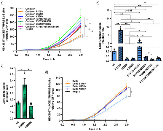 For lenti-Spike preparation, HEK293T cells were transfected with pcDNA3.1-SARS2-Spike-Delta/Omicron (1.5 µg), pGIPZ-tGFP (3.5 µg) and pCMV-ΔR8.9 plasmids (3 µg). After 2.5 days, the lenti-Spike virion-containing medium was filtered through a 0.45 µm membrane filter (Sartorius, Beit Haemek, Israel). The medium with the virions was adjusted to equal amounts based on the RNA levels and added directly to cells and washed away after eight h. Hoechst 33342 solution (1:2000, Molecular Probes, Life Technologies, Carlsbad, CA, USA) was added after 1.5 days, before microscopically analyzing infection efficiency. The ratio of Hoechst-stained nuclei (all cells) and GFP-emitting cells (infected cells) was quantified by using the previously described ImageJ macro [27].