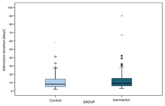 Length of hospital stay in IVM-treated cases and controls. * outliers.