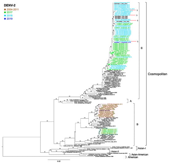 For the DENV2 dataset, a total of 168 sequences were used for the phylogenetic analysis (Table S2). We included 30 sequences from the present study and 67 reported sequences from Bangladesh. The DENV2 genotyping dataset (1485 bp in length) included the following five distinct genotypes: Asian-I (n = 4), Asian-II (n = 2), cosmopolitan clade A (n = 4), cosmopolitan clade B (n = 41), cosmopolitan clade C (n = 113), American (n = 1), and Asian/American (n = 3). For the DENV3 dataset, a total of 275 sequences were used for the phylogenetic analysis (Table S2). We included 140 sequences from the present study and 82 previously published sequences from Bangladesh. The DENV3 genotyping dataset (1479 bp in length) included the following five distinct genotypes: I (n = 218), II (n = 44), III (n = 6), IV (n = 3), and V (n = 4).