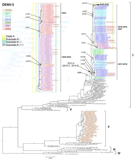 For the DENV3 samples, out of 402 DENV3 specimens, we determined the nucleotide sequences of the enveloped regions in 140 specimens (24 from 2018, 37 from 2019, 40 from 2021, and 39 from 2022). All of the samples in the present study clustered with DENV3 genotype I (Figure 3). The Bangladesh DENV3-I viruses were very closely related to strains collected in Bangladesh at a similar time. Viruses collected in Bangladesh from 2017 to 2022 formed a monophyletic clade (denoted as clade A), sharing a common ancestor with a 2014 Malaysian strain (MG895255). Furthermore, the DENV3-I virus was found to have circulated in Indonesia and Singapore in 2013–2016, and in Myanmar, Thailand, China, and Vietnam in 2015–2018 (Figure 3). The earliest DENV3 genotype I was identified in Malaysia in 1974 and Indonesia in 1978. Our previously published sequences for DENV3 in 2017 also clustered in the same genotype (genotype I), and these viruses are suspected to have been introduced to Bangladesh around mid-2013 (March 2012–September 2014) []. Although the sequences that were previously obtained for Bangladesh for 2000 to 2009 that were deposited in the NCBI database were grouped in with DENV3 genotype II, these genotype II viruses were not detected in the present study. This result suggests that the previously observed DENV3 genotype II in Bangladesh has been replaced by genotype I from 2017.