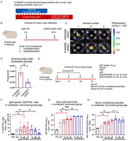 Evaluating S-540956 and ODN2006 adjuvants in guinea pigs. (A) Adjuvant design for ODN2006 and S-540956. The single-stranded ODN2006 is shown in blue. S-540956 is double-stranded, consisting of ODN2006 and a complementary strand, shown in red, that is linked to an amphiphilic chain. (B) Experimental design to detect trafficking of ODN2006-AF647 or S-540956-AF647 to draining lymph nodes in naïve guinea pigs. (C,D) Draining lymph nodes were collected at 24 h, and fluorescence intensity was recorded as mean photons per draining lymph node (n = 3/group). The p value was calculated by unpaired t-test with Welch’s correction. (E) Experimental design for immunizing naïve guinea pigs with PBS, gD2 alone, or gD2 administered with 13, 26, or 52 nmol ODN2006 or S-540956. (F–H) Splenocyte CD8+IFNγ+ responses (% CD8+IFNγ+CTV− cells), serum gD2 IgG titers, and serum-neutralizing antibody titers were measured on day 42. p values in (F–H) were calculated by the Mann–Whitney test, with the primary comparison between gD2/S-540956 and PBS (highlighted by red brackets) and with no adjustment for multiple comparisons. n = 4 per group, except gD2/S-540956 at 26 or 52 nmol, n = 5/group. * p < 0.05; ns: p value not significant.