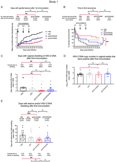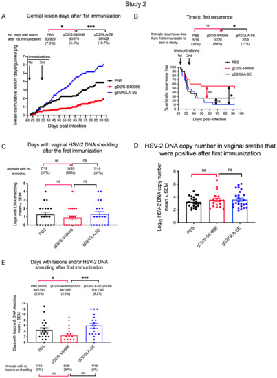 We evaluated the number of animals that remained free of recurrent genital lesions and/or recurrent vaginal shedding of HSV-2 DNA in the gD2/S-540956 and PBS groups for individual studies 1 and 2, as well as the two studies combined. These data are based on the results of study 1 shown above Figure 3B,C, and those of study 2 above Figure 7B,C (Table 2). We conclude that significantly more animals in the gD2/S-540956 than PBS groups had no recurrent genital lesions and no vaginal shedding of HSV-2 DNA.