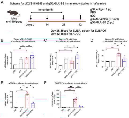 Naïve mice: Analytical tools for ADCC and T cell studies are limited in guinea pigs. Therefore, we first compared the immune responses to S-540956 and GLA-SE in mice (schema Figure 4A). Serum gD2 IgG ELISA titers were significantly higher in the gD2/S-540956 mice than in the PBS group (Figure 4B), with a predominant IgG2c isotype response, suggesting a T helper type 1 (Th1) response (Figure 4C,D). Antibody-dependent cellular cytotoxicity (ADCC) and T cell enzyme-linked immunospot (ELISPOT) responses were also significantly higher in the gD2/S-540956 mice than the PBS controls or the gD2 only or gD2/GLA-SE groups (Figure 4E,F).