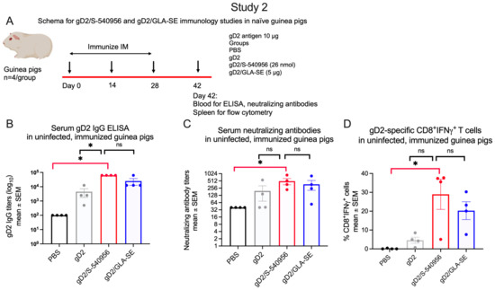 Antibody and cellular immune responses in uninfected (naïve) guinea pigs immunized with PBS, gD2 alone, gD2/S-540956, or gD2/GLA-SE. (A) Experimental design for immunization studies in uninfected guinea pigs. (B–D) Serum gD2 IgG ELISA, serum-neutralizing antibody titers, and gD2-specific CD8+IFNγ+ T cells (n = 4/group). p values were calculated by the two-tailed Mann–Whitney test, with the primary comparison between gD2/S-540956 and PBS (highlighted by red brackets). * p < 0.05; ns: p value not significant.