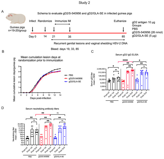 Antibody responses in infected guinea pigs immunized with PBS, gD2/S-540956, or gD2/GLA-SE. (A) Experimental design of studies in infected and subsequently immunized animals. (B). Mean cumulative days with genital lesions prior to randomization on day 14 (n = 19 in PBS and gD2/GLA-SE, n = 20 in gD2/S-540956). (C,D) Serum gD2 IgG ELISA titers and neutralizing antibody titers in the presence of complements (n = 8–10/group). p values in (C,D) were calculated by the Wilcoxon matched-pairs signed rank test for comparisons within groups, while comparisons between groups were performed by the two-tailed Mann–Whitney test. * p < 0.05; ** p < 0.01; **** p < 0.0001; ns: p value not significant.