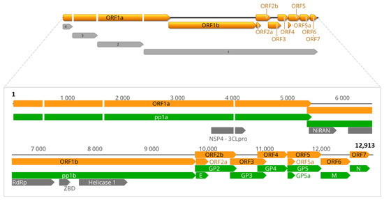 Most viruses in this family lack experimental characterization. However, based on those more intensely studied, they are assumed to present spherical, pleomorphic, enveloped virions ranging from 50 to 74 nm in diameter, containing a positive-sense, single-stranded and multi-cistron RNA genome of 12.7–15.7 kb. The genomic organization of the family slightly varies in the ORF’s content but conserves characteristic features and domains among all species. Five domains located in the replicase ORFs 1a (3C-like protease-3CLpro) and 1b (nidovirus RdRp-associated nucleotidyltransferase-NiRAN; RNA-dependent RNA polymerase-RdRp; Zn-binding domain-ZBD; and superfamily 1 helicase-HEL1) are the standard markers for the phylogenetic inferences and genetic distance indexes used for taxonomic demarcation within the family [5].