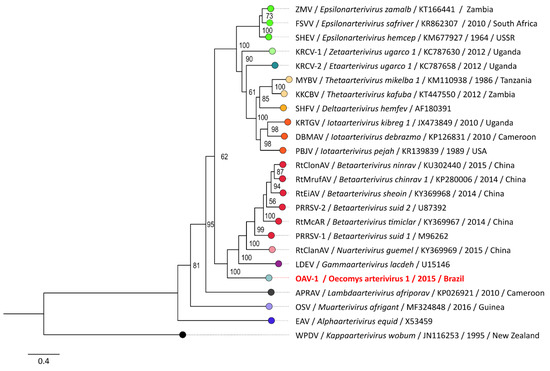 Although the mean distance between OAV-1 and members of the Variarterivirinae subfamily slightly surpasses maximum intragroup distance for the subfamily, the taxon is the most related to the virus, and the distance values between OAV-1 and the variarterivirins are completely out of the intergroup range. Furthermore, as for comparison, the distances between OAV-1 and four of the eight Variarterivirinae species are equal or lower than those found between members of distinct genera in the Simarterivirinae subfamily.