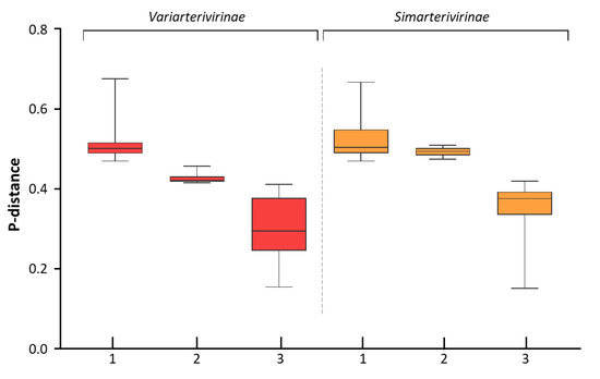The intergroup and intragroup distances represent the overall level of amino acid divergence between the selected taxon and the other representants of the family, and within the subfamily, respectively. The intergroup distances are above a minimum p-distance value of 0.470 for the Variarterivirinae and Simarterivirinae subfamilies, which possess the largest number of species and are the only ones that harbor more than one species.