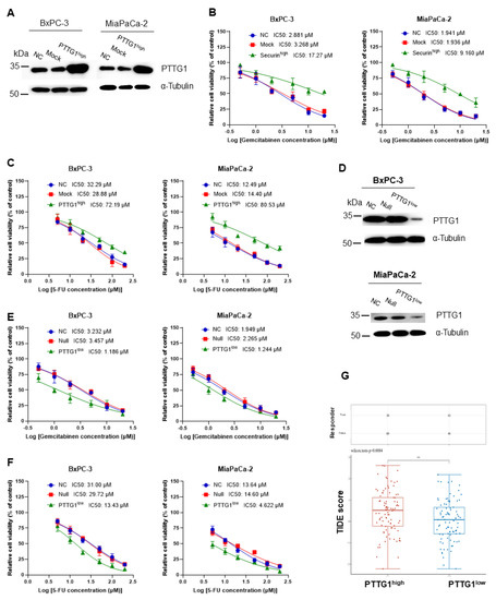 PTTG1 increased chemotherapy and immunotherapy resistance in pancreatic cancer cells. (A) Overexpressed PTTG1 in BxPC-3 and MIA PaCa-2 cells. The IC50 of (B) gemcitabine and (C) 5-fluorouracil (5-FU) in PTTG1-overexpressed BxPC-3 (BxPC-3-PTTG1high) and MIA PaCa-2 (MIA PaCa-2-PTTG1high) cells. (D) Knocked down PTTG1 in BxPC-3 and MIA PaCa-2 cells using CRISPR/Cas9. The IC50 of (E) gemcitabine and (F) 5-fluorouracil (5-FU) in PTTG1 knockdown BxPC-3 (BxPC-3-PTTG1low) and MIA PaCa-2 (MIA PaCa-2-PTTG1low) cells. Cell viability was measured using CCK-8 assay. All IC50 experiments were conducted in triplicate. (G) The ICB response with TIDE algorithm in PTTG1high and PTTG1low groups of pancreatic cancer. NC: parental cells without treatment. Mock: cells transfected with pCMV-IRES-Neo/KanR backbone vectors. PTTG1high: cells overexpressing PTTG1. Null: cells transfected with CRISPR/Cas9 backbone vectors. PTTG1low: cells knocking PTTG1. **: p < 0.01.