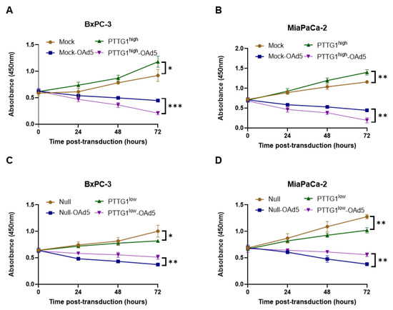 Influence of PTTG1 on OAd5 efficiency on pancreatic cancer cells. (A) BxPC-3-PTTG1high, (B) MIA PaCa-2-PTTG1high, (C) BxPC-3-PTTG1low, and (D) MIA PaCa-2-PTTG1low cells were transduced with OAd5, cell viability was monitored using CCK-8 assay 0-, 24-, 48- and 72-h post-transduction. Mock: cells transfected with pCMV-IRES-Neo/KanR backbone vectors. PTTG1high: cells-overexpressing PTTG1. Mock-OAd5: cells carrying pCMV-IRES-Neo/KanR backbone were transduced with OAd5. PTTG1high-OAd5: cells overexpressing PTTG1 were transduced with OAd5. Null: cells transfected with CRISPR/Cas9 backbone vectors. PTTG1low: cells knocking PTTG1. Null -OAd5: cells carrying CRISPR/Cas9 backbone were transduced with OAd5. PTTG1low-OAd5: cells knocking PTTG1 were transduced with OAd5. All experiments were conducted in triplicate. Nonparametric test was used to analyze differences between two groups. All data are mean ± SD. *: p < 0.05. **: p < 0.01. ***: p < 0.001.