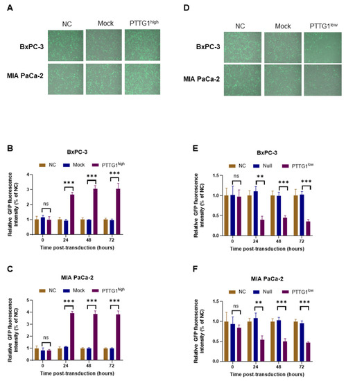 We then measured GFP expression in BxPC-3 and MIA PaCa-2 cells after OAd5 transduction. The results showed that the fluorescence intensity was enhanced in BxPC-3-PTTG1high and MIA PaCa-2-PTTG1high cells (Figure 4A) and decreased in BxPC-3-PTTG1low and MIA PaCa-2-PTTG1low cells (Figure 4D) 24 h after OAd5 transduction. However, the magnitude of the difference in GFP intensity from the control group did not further increase in (Figure 4B) BxPC-3-PTTG1high and (Figure 4C) MIA PaCa-2-PTTG1high cells or decrease in (Figure 4E) BxPC-3-PTTG1low and (Figure 4F) MIA PaCa-2-PTTG1low over time. Because OAd5 mainly replicates 24–48 h after transduction, the results indicate that PTTG1 might increase OAd5 entrance into pancreatic cancer cells, but it does not play a role in its replication.
