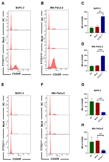 Influence of PTTG1 on CXADR expression on pancreatic cancer cells. CXADR expression on BxPC-3-PTTG1high and MIA PaCa-2-PTTG1high cells was detected using flow cytometry. (A,B) The representative histogram is shown. Mean fluorescence index (MFI) of CXADR expression on (C) BxPC-3-PTTG1high and (D) MIA PaCa-2-PTTG1high cells was analyzed. CXADR expression on BxPC-3-PTTG1low and MIA PaCa-2-PTTG1low cells was detected using flow cytometry. (E,F) The representative histogram is shown. MFI of CXADR expression on (G) BxPC-3-PTTG1low and (H) MIA PaCa-2-PTTG1low cells was analyzed. All experiments were conducted in triplicate. Nonparametric test was used to analyze differences between two groups. All data are mean ± SD. **: p < 0.01. ***: p < 0.001.