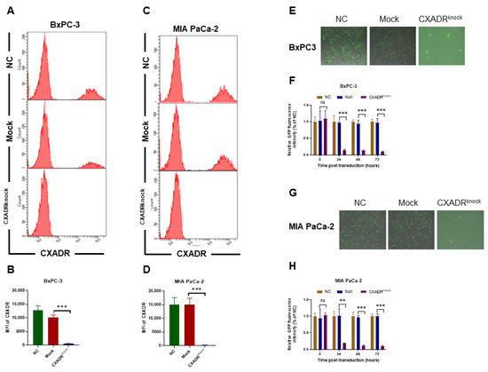 To further investigate the role of CXADR in PTTG1 in promoting OAd5 entrance into cells, we knocked CXADR in BxPC-3-PTTG1high and MIA PaCa-2-PTTG1high cells using CRISPR/Cas9 technology. To validate the role of CXADR in PTTG1-mediated OAd5 entrance, we used the CXADR-knocked BxPC-3-PTTG1high (Figure 6A,B) and MIA PaCa-2-PTTG1high (Figure 6C,D) cells during OAd5 transduction. Then, GFP intensity assay showed that BxPC-3-PTTG1high (Figure 6E,F) and MIA PaCa-2-PTTG1high (Figure 6G,H) cells failed to further enhance OAd5 transduction in the presence of CXADR knockdown.