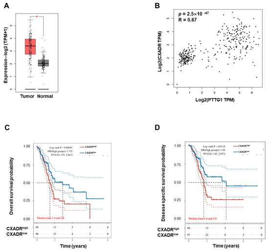 The correlation between PTTG1 and CXADR in normal and malignant pancreatic tissues. (A) CXADR expression analysis in PAAD from TCGA database using GEPIA 2.0. The two groups include 179 cases of pancreatic cancer tumor tissues and 171 cases of normal pancreas tissues. (B) The Spearman rank correlation between PTTG1 and CXADR mRNA expressions in normal and cancerous pancreatic tissues. The analysis was performed at the GEPIA 2.0 website based on the merge data from TCGA Tumor, TCGA Normal, and GTEx databases. (C) CXADR expression and overall survival, (D) PTTG1 expression and disease-specific survival were analyzed in the TCGA cohort. Hazard ratio (HR) > 1 indicates the gene is a risk factor. HR (95% Cl), the median survival time (LT50) for different groups. *: p < 0.05.
