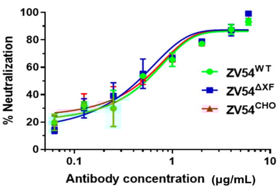After confirming the specific binding of the ZV54 variants to zDIII, we examined the potential of the ZV54 glycovariants in neutralizing ZIKV by a PRNT assay. As shown in Figure 1, both ZV54WT and ZV54∆XF exhibited potent neutralizing activity against ZIKV, similar to that of ZV54CHO (p > 0.99, for both ZV54WT and ZV54∆XF compared to ZV54CHO), with IC50 values of 1.97, 0.86, and 2.01 µg/mL for ZV54WT, ZV54∆XF, and ZV54CHO, respectively (Figure 1). These values represented the neutralization potency of ZV54 against a highly virulent American ZIKV strain that has not been reported in other studies [8].
