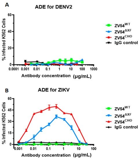 ADE activity of the ZV54 mAb glycovariants for DENV and ZIKV infection. DENV-2 (A) or ZIKV (B) samples were mixed with serial dilutions of the ZV54 mAb glycovariants or a generic IgG negative control and then incubated with FcγRIIa+ K562 cells. The cells were then washed, fixed, permeabilized, and stained with an anti-flavivirus E antibody. The DENV-2 or ZIKV infected cells were identified by flow cytometry. The experiments were performed at least twice, with technical triplicates for each sample of the presented results (means ± SDs).