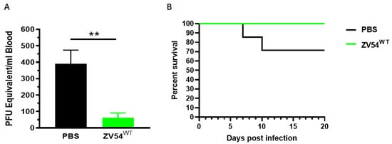 The in vivo efficacy of ZV54WT was tested in a mouse model as this glycovariant appears to preserve ADCC activity while forgoing ADE for both DENV and ZIKV infection. Five-week-old Ifnar1−/− mice were divided into two groups, and both groups were infected with ZIKV via footpad inoculations. Twenty-four (24) hours post-infection, the mice in group 1 were treated with ZV54WT (280 μg) while the mice in group 2 were administered with an equivalent volume of PBS. The RT-qPCR analysis indicated that the mice treated with ZV54WT developed significantly lower viremia peaks at 3 days post-infection compared to the PBS-injected mice (p = 0.0065) (Figure 4A). Furthermore, 100% of the mice treated with ZV54WT survived the ZIKV challenge compared to 70% for the mice that received PBS (Figure 4B). This result demonstrated that while forgoing ADE activity, the plant-derived ZV54WT glycovariant retained the in vivo therapeutic efficacy against ZIKV infection.