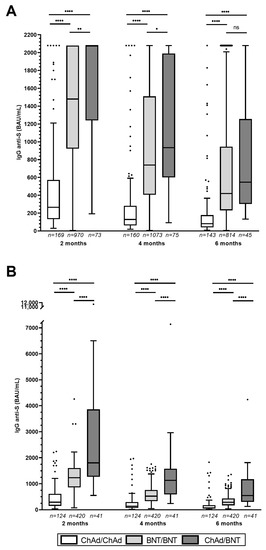 - Barocci, S.; Orlandi, C.; Diotallevi, A.; Buffi, G.; Ceccarelli, M.; Vandini, D.; Carlotti, E.; Galluzzi, L.; Rocchi, M.B.L.; Magnani, M.; et al. Evaluation of Two-Month Antibody Levels after Heterologous ChAdOx1-S/BNT162b2 Vaccination Compared to Homologous ChAdOx1-S or BNT162b2 Vaccination. Vaccines 2022, 10, 491. [Google Scholar] [CrossRef] [PubMed]