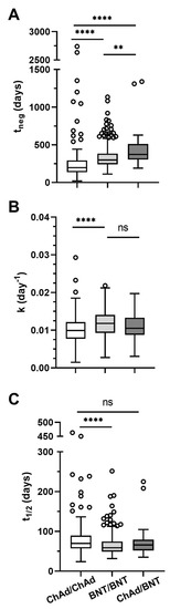 | Kinetic parameter * | tneg (days) | Median (IQR) | 197 (137–292) | 300 (242–383) | 372 (304–511) |
