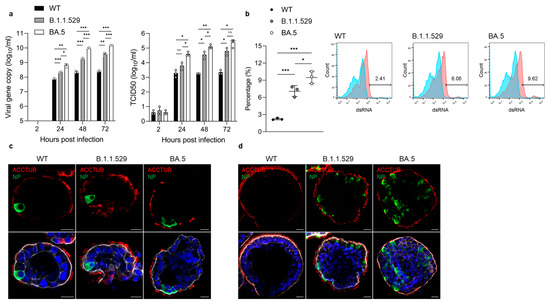 - Chiu, M.C.; Li, C.; Liu, X.; Yu, Y.; Huang, J.; Wan, Z.; Xiao, D.; Chu, H.; Cai, J.P.; Zhou, B.; et al. A bipotential organoid model of respiratory epithelium recapitulates high infectivity of SARS-CoV-2 Omicron variant. Cell Discov. 2022, 8, 57. [Google Scholar] [CrossRef] [PubMed]