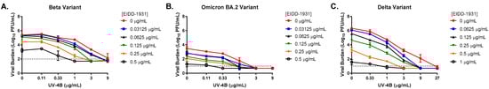 Six concentrations of UV-4B ranging from 0 to 9 μg/mL and EIDD-1931 ranging from 0 to 0.5 μg/mL were evaluated both as mono- and combination therapy against the beta and omicron BA.2 variants of SARS-CoV-2 in ACE2-A549 cells (Figure 1A,B). Monotherapy studies with the delta variant revealed that higher concentrations of UV-4B and EIDD-1931 were required to completely suppress viral replication relative to those needed to curb replication of the beta and omicron BA.2 variants. Thus, drug concentrations ranging from 0 to 27 μg/mL (UV-4B) and 0–1 μg/mL (EIDD-1931) were evaluated against the delta variant strain of SARS-CoV-2 (Figure 1C).