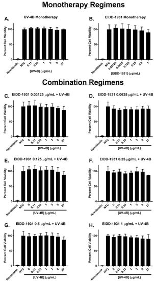 The UV-4B and EIDD-1931 monotherapy and combination regimens assayed in our antiviral evaluations were also investigated for their effect on cell health using the WST-1 cell proliferation assay (Roche Diagnostics GmbH; Mannheim, Germany) as previously described [9]. The effect of each regimen on cell viability was determined by calculating percent cell viability relative to untreated cells.