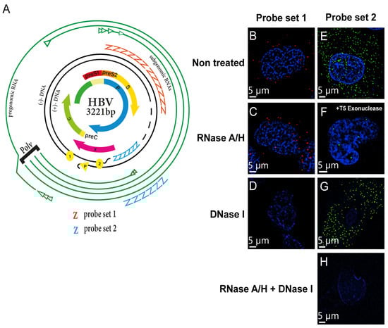 The observation of HBV DNA, RNAs, and cccDNA at single-molecule resolution facilitate provided insights into the interaction of key HBV nucleic acids with host factors. Here, we employed FISH with the branched DNA amplification method for the direct visualization of HBV DNA, RNAs, and cccDNA with fluorescent probes in order to identify proteins potentially associated with HBV (Figure 1A) [12]. We used two probe sets that could target HBV DNA, pgRNA, and cccDNA in combination with various DNases and RNases.