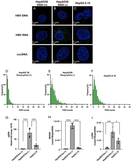 Detection of HBV nucleic acids in HBV-replication cell lines. FISH signals were detected in HepG2.2.15 and HepAD38 cells, pretreated with the indicated reagents, and hybridized with probe sets 1 and 2. HepAD38 cells were maintained in the presence of doxycycline (control) and without the antibiotic (induced). (A) Viral replication in HepAD38 cells with doxycycline (1 µg/mL). (B) Viral replication in HepAD38 cells was induced by removing doxycycline from the medium. (C) Viral replication in HepG2.2.15 cells. Scale bar, 5 µm. FISH counts were derived from a total of 200 nuclei. HepAD38 doxycycline (+) (D), HepAD38 doxycycline (−) (E), and HepG2.2.15 (F). pgRNA (G), HBV DNA (H), and cccDNA (I) from cell lysates were measured by real-time PCR. Representative results from three independent experiments are shown. Statistical differences were assessed by one-way ANOVA. * p < 0.05, *** p < 0.001, **** p < 0.0001.