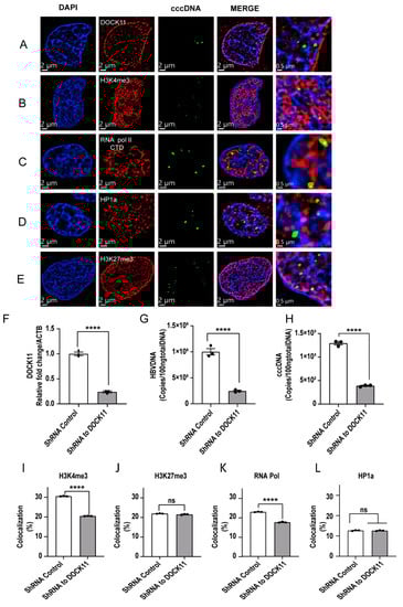Colocalization of cccDNA with DOCK11 and histone markers, as determined using Dragonfly confocal microscopy. (A–D) HepAD38 cells were passaged to 8-well chamber slides, pretreated with RNase A/H to eliminate HBV RNAs, and then hybridized to probe set 2 to detect cccDNA (green). Cells were then stained with anti-DOCK11 (red) (A), anti-H3K4me3 (red) (B), anti-H3K27me3 (red) (C), anti-RNA polymerase II CTD (red) (D), or anti-HP1α antibody (red) (E). Images were obtained using Dragonfly confocal microscopy using a 60× objective. The nucleus was stained with DAPI (blue). Scale bars, 2 μm and 0.5 μm. (F–L) HepAD38 cells were transiently transfected with DOCK11 shRNA. DOCK11 mRNA (F), HBV DNA (G), and cccDNA (H) levels were detected by RT-PCR. Colocalized signals of cccDNA with H3K4me3 (I), H3K27me3 (J), RNA polymerase II CTD (K), and HP1α (L) were captured by a Dragonfly confocal microscope, and then the fluorescence signal counts per cell in each sample were determined using ImageJ software. Representative results from three independent experiments are shown. Statistical differences were assessed by unpaired t-test. **** p < 0.0001; ns: not significant.