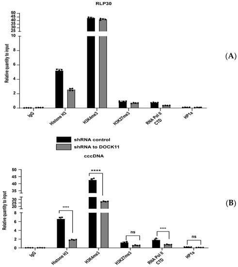 One week later, ChIP experiments were performed in DOCK11-knockdown and control cells, using a ChIP kit (SimpleChIP® Enzymatic Chromatin IP Kit (Magnetic Beads), #9003; Cell Signaling Technology), following the manufacturer’s protocol. Briefly, protein–DNA complexes were cross-linked using 1% formaldehyde and then quenched with 0.125 M glycine. To prepare the nuclear extract, the cells were lysed in lysis buffer containing protease inhibitor. The samples were sonicated to reduce the chromatin to an average length of about 1 kb, and they were ultracentrifuged; the supernatant was collected and diluted 1:10 with dilution buffer, and the appropriate antibodies were added. Chromatin was immunoprecipitated overnight at 4 °C, using 10 µg of the antibodies listed in Table S1. Normal rabbit IgG antibody was used as the negative control, while histone H3 antibody was used as the positive control. Then, the immune complexes were incubated with protein A/protein G agarose beads at 4 °C, washed, and eluted in 1× ChIP buffer. Finally, using RLP30- and cccDNA-specific primers, the immunoprecipitated DNA was quantified by qPCR.