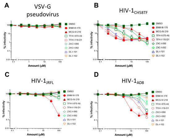 The viral infection assay was performed as previously described [38]. Briefly, TZM-bl target cells were seeded at a density of 1 × 104 cells/well in 96-well luminometer-compatible tissue culture plates (Perkin Elmer, Woodbridge, ON, Canada) 24 h before infection. HIV-1CH58TF, HIV-1JRFL, or HIV-1AD8 viruses with comparable infectivity (~1 million of RLU when infecting TZM-bl cells with 100 μL virus) in a final volume of 100 μL were incubated with indicated amount of different compounds or the same volume of DMSO for one hour at 37 °C, then the mixture was added to the target cells followed by incubation for 48 h at 37 °C; the medium was then removed from each well, and the cells were lysed by the addition of 30 μL of passive lysis buffer (Promega, Madison, WI, USA) and three freeze–thaw cycles. An LB 941 TriStar luminometer (Berthold Technologies, Bad Wildbad, Germany) was used to measure the luciferase activity of each well after the addition of 100 μL of luciferin buffer (15 mM MgSO4, 15 mM KPO4 (pH 7.8), 1 mM ATP, and 1 mM dithiothreitol) and 50 μL of 1 mM D-luciferin potassium salt (Prolume, Randolph, VT, USA).