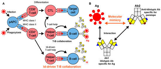 Two forms of T-B collaboration and molecular mimicry. (A) Infecting antigens or antigens taken up by phagocytosis in a professional antigen-presenting cell (pAPC) are processed and presented as peptides (red) on the MHC molecule to be recognized by specific T-cells. The activated T-cells recognize a peptide (T-cell epitope) on a target cell or B-cell and exert effector functions as cytotoxic T lymphocytes (CTLs) in cellular immunity and as helper T-cells both in cellular and humoral immunity, respectively. In T-B collaboration, the helper T-cells recognize an antigen-derived peptide (red) and promote the production of antibodies against the antigen, while in idiotope (id)-driven T-B collaboration, they recognize an idiotypic peptide (red) and help B-cells produce antibodies containing ids (red). (B) Molecular mimicry. Antibody 1 idiotypic antibody (Ab1) is specific for an antigen (Ag). Anti-idiotypic antibody Ab2 will be induced as a consequence of idiotypic interactions and will recognize Ab1. Ab2 is specific for the paratope of Ab1, and thus, exhibits molecular mimicry with the Ag. Analysis of Ab2 sequences will thus identify Ag-derived sequences.