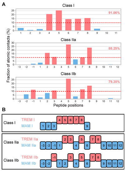 T-cell epitope motif patterns in TREM and MAM. (A) Fraction of atomic contacts in TCR–peptide binding was determined per position of the peptide (see Supplementary Data File S1 for details). The fraction of contacts with TCR relative to the total number of TCR–peptide binding contacts is shown with fractions of over 10%, highlighted in red, and the other positions with less contact with TCR are shown in blue. For each class of TCR–peptide binding, the total frequencies for the five positions with fractions of over 10% are indicated on the upper right. (B) One 9-mer class I and two 15-mer class II peptides (IIa and IIb) show distinct motif patterns in contact with TCR (TREM) and MHC (MAM). In the class I peptide, the central residues (P4–8) are recognized by the TCR, and the other positions are in contact with the MHC (MAM I). By contrast, for class II peptides, non-continuous amino acid residues in a peptide are exposed to the TCR (P2,3,5,7,8 for TREM IIa, and P-1,3,5,7,8 for TREM IIb), and the other positions show fewer contacts contributed to the interaction with MHC, such as MAM IIa and MAM IIb.