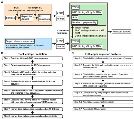 First, the unbiased BCR repertoire analysis method we developed [40] was employed to identify specific BCR clones (Figure 3A). Normally, the BCR repertoire observed in healthy donor samples has extremely high diversity, and BCR clones with high frequencies ≥1% are rare. By contrast, such clones are often observed in samples undergoing immune responses and are considered highly specific and related to the immunological state. Therefore, we selected such clones for subsequent analysis using our pipelined T-cell epitope prediction algorithm (Figure 3B). The FL sequences of BCR clones were produced in Step 1. Subsequently, BCR repertoire-specific TREM sequences were identified and characterized in terms of their TREM pattern, MHC binding affinity, SHM, and B-cell epitope probability in Steps 2–4. Reference TREM sequences and repertoire–reference common TREM were determined and characterized in Steps 5 and 6. After sample-specific TREM sequences were identified in Step 7, T-cell epitope candidates shared among samples were selected in Step 8.