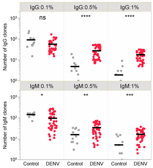 Expansion of IgG and IgM clones in response to DENV infection. The number of BCR clones (IgG, upper and IgM, lower) were compared between healthy donor controls and DENV infection for each of the frequencies over 0.1%, 0.5%, and 1%. Black bars indicate the mean number of clones. Statistical significance was analyzed using the Mann–Whitney U test. * p < 0.05, ** p < 0.01, *** p < 0.001, **** p < 0.0001, ns: not significant.