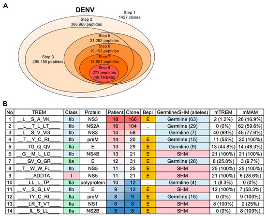 Predicted TREMs in DENV infection. (A) Summary of the number of peptides resulting from each step of the epitope prediction for DENV. The number of clones or peptides includes all samples examined, and peptides were selected and narrowed down using Vietnam isolates as primary reference sequences at Step 8. A total of 49 TREMs were identified by analyzing 1427 clones with a frequency of ≥1% from 18 DENV patients. (B) Top 14 TREMs shared by more than five individuals (see also Supplementary Data File S2 for details of all 49 TREMs). Among them, 46 TREMs were class II epitopes (IIa or IIb). TREMs shared among individuals tend to germline-typed sequences, whereas patient-unique TREMs contain SHMs and are found in CDR3 overlapping regions. A total of 43 out of 49 showed B-cell linear epitope potential. A total of 22 TREMs were found in T-cell epitopes that have previously been reported to induce T-cell activity (Supplementary Data File S2). Note that SHMs are also found in MAM sequences.