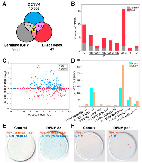 Characterization and T-cell immunogenicity of TREM/MAM epitopes from DENV-responsive BCR clones. (A) Overlap of TREM sequences among DENV-1, germline IGHV, and DENV-responsive BCR clones. (B) Distribution of identified TREMs in the variable region of the immunoglobulin sequence. (C) MA plot showing alternation of MHC binding affinity (IC50) from germline MAM sequences to mutated sequences in BCR clones. M: log2(IC50 of BCR peptide sequences with MAM mutated/IC50 of germline BCR peptide sequences). A: 1/2(log2(IC50 of BCR peptide sequences with MAM mutated) and log2(IC50 of germline BCR peptide sequences). Blue (up) and red (down) points indicate increased and reduced HLA binding affinity by SHM, respectively. (D) IL-4-producing spot-forming cell (SFC) counts following stimulation with eight different peptides in cultured ELISPOT assays. Details of the peptides are shown in Table 3. PBMCs derived from two different donors were tested. Peptide sequences with TREM in bold and underlined text are indicated. (E) Representative cultured ELISPOT assays of T-cell responses with control (left) and DENV no. 2 peptide (HQLWATLLSLTFIKT, right). The representative images and spot counts are shown for IFN-γ and IL-4, with the mean number of spots of duplicate wells shown in parenthesis. (F) Ex vivo ELISPOT assays showing T-cell stimulation with a pool of eight identified peptides in PBMCs from cases with a history of DENV infection (right) but not in DMSO controls (left). The representative images and spot counts are shown for IFN-γ and IL-4.