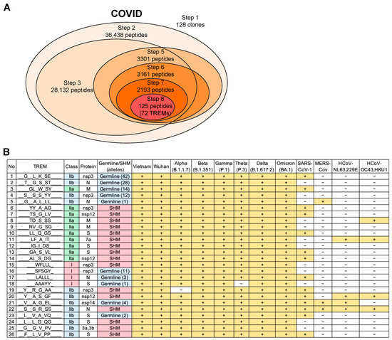 Predicted SARS-CoV-2 T-cell epitopes with previously confirmed T-cell activity. (A) Summary of the number of peptides resulting from each step of the epitope prediction for COVID. The number of clones or peptides include all samples examined, and peptides were selected and narrowed down using Vietnam isolates as primary reference sequences at Step 8. (B) A total of 26 out of 72 TREMs that were identified by analyzing 128 clones with a frequency ≥1% from 20 COVID-19 patients were among the T-cell epitopes that had previously been reported to induce T-cell activity (see also Supplementary Data File S3 for details), and conserved across SARS-CoV-2 variants and other coronaviruses (denoted as “+”).