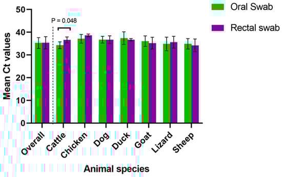 SARS-CoV-2 was detected in all animal species analyzed by RT-qPCR except pigeons. Of the 364 animals screened by RT-qPCR, 167 (45.9%) were confirmed positive for SARS-CoV-2. Positivity to SARS-CoV-2 considering both oral and rectal swabs was 16.5% (60/364). With oral swabs only, 39.9% (137/343) were confirmed positive while 32.5% (91/280) were positive with rectal swabs only. There was no significant difference in SARS-CoV-2 positivity between oral and rectal swab samples (p = 0.07). The Ct values of SARS-CoV-2 positive animals ranged from 28.52 to 39.37 using oral swabs and 24.99 to 39.31 using rectal swabs. Overall, there was no significant difference in the mean Ct values of oral and rectal swabs (p = 0.73). However, in cattle, the mean Ct value for rectal swabs was significantly higher than that of oral swabs (p = 0.048) (Figure 2).