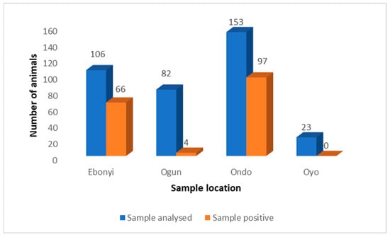 Comparison of SARS-CoV-2 PCR positivity rates in animals by location in Nigeria.
