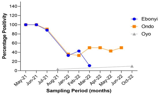 Out of the samples screened using RT-qPCR, 183 were obtained in 2021 and the remaining 181 were obtained in 2022. SARS-CoV-2 positivity was significantly higher in animals sampled in 2021 (61.2%) compared to those sampled in 2022 (30.4%) (p < 0.0001). Samples from Oyo State were all obtained in 2022. The highest positivity rates (100%) were observed in May and June 2021 for both Ebonyi and Ondo States. This was followed by a decrease in positivity in July 2021 to 88.2% and 90.4% in Ebonyi and Ondo States, respectively. Despite the fluctuation in positivity rates in both states, SARS-CoV-2 positivity was higher in 2021 than in 2022 (Figure 4). In Ebonyi State, SARS-CoV-2 positivity dropped to levels lower than 20% from February while in Ondo State, it remained above 40% till the end of sampling in June 2022 (Figure 4).
