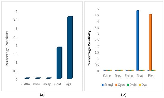 In general, SARS-CoV-2 positivity using ELISA was observed in one species per state. In Ogun State, pigs were the only animal species in which antibodies to SARS-CoV-2 were detected and in Ebonyi state, antibodies to SARS-CoV-2 were only detected in goats (Figure 6b).