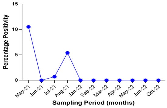 Temporal distribution of SARS-CoV-2 positivity using PCR in animal species in the sampling locations over the duration of study.