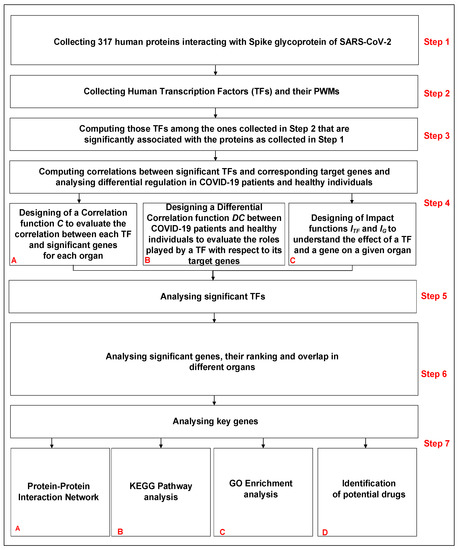 Initially, 317 human proteins which interact with Spike glycoprotein of SARS-CoV-2 are considered (Step 1 of Figure 1). Thereafter, a complete list of 23,459 human genes and 73,432 related transcripts is collected. Promoter sequences (2000 base pairs upstream of the Transcription Start Site are considered according to [15]) of the collected genes/transcripts are retrieved using the package “TxDb Hsapiens UCSC.hg19.KnownGene” version 3.2.2 of R software (https://bioconductor.org/packages/release/data/annotation/html/TxDb.Hsapiens.UCSC.hg19.knownGene.html, accessed on 22 January 2022). A complete list of known and reliable human 626 TFs is selected and the related consensus pattern sequences expressed in terms of Position Weight Matrices (PWMs) are retrieved via the JASPAR database [16] (Step 2 of Figure 1). Transcription Factor binding Sites (TFBSs) associated with each considered human TF are predicted through the matchPWM() function, integrated into the Biostrings R library (https://bioconductor.org/packages/release/bioc/html/Biostrings.html, accessed on 22 January 2022), with a threshold of 0.90. Hypergeometric tests are then performed to assess the association between a given TF and the input set of genes (Step 3 of Figure 1). Such tests are performed for each selected TF in order to evaluate TFBS enrichment in the promoter regions of COVID-19 associated human genes. In other words, the number of genes in the pool set associated with COVID-19 showing at least one TFBS in the promoter region is compared with the number of genes showing at least one TFBS in the set of all human genes, thereby providing the corresponding p-value. The obtained p-values are then adjusted using Bonferroni’s correction. Significant TFs are finally selected by setting a strict threshold corresponding to an adjusted p-value of <. The whole procedure is fully described and the software is available in [13].