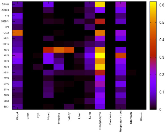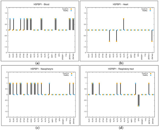 As can be observed in panel (a) of Figure 2, the value for the gene HSPBP1 and organ blood is equal to −1 for the TFs such as ELK1, ELK2, ETV3 and ETV4. This is because for the aforementioned TFs, there is a positive correlation in healthy and no correlation in COVID-19 patients, while the correlation is 0 for the other TFs. When considering the organ heart (panel (b) of Figure 2), values are as follows: −1 for the TFs such as HES1, KLF3 and ZNF460 (negative correlation in COVID-19 and no correlation in healthy), +1 for KLF6 (positive correlation in COVID-19 and no correlation in healthy) and 0 for the other TFs. In the same way, we have obtained values for nasopharynx and respiratory tract, which are as follows: +1 for ELK3, ELK4, ETV6, KLF3, KLF5, ZBTB14 and ZNF460, −1 for KLF15 in the nasopharynx while +1 for ETV3, KLF3, KLF5 and ZBTB14 and −1 for SP9 in the respiratory tract.