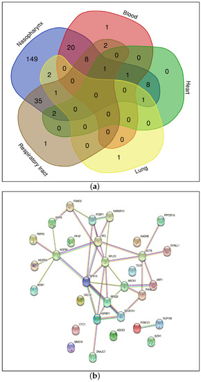 Figure 4a reports the common genes among five organs: the blood, heart, lung, nasopharynx and respiratory tract. The total number of common genes is 31. Table 3 shows these 31 significant genes by considering the ranking method; for example, a designation of 4* indicates that the gene HSPBP1 is common among four organs such as the blood, heart, nasopharynx and respiratory tract, while 3* indicates that genes such as ARCN1 and PRPF6 are common among organs such as the heart, lung and nasopharynx and so forth.