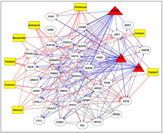Table 4 reports the drugs targeting the 31 human proteins as identified earlier, along with their adjusted p-values and DrugBank IDs (https://go.drugbank.com/drugs, accessed on 10 May 2023) (Step 7-C of Figure 1). As can be seen from the table, several drugs such as nitrofural, clindamycin, ipratropium, ambroxol, pacilataxel, benserazisde, amikacin and captopril are used for the treatment of different types of cancer, for Parkinson’s disease and for antibiotic and antibacterial applications in some instances. Among these drugs, Amikacin has been found to be the best aminoglycosides as a potential inhibitor of SARS-CoV-2 [22]. As reported in [23], a 66-year-old man infected with COVID-19 was given Ipratropium Bromide solution, among other drugs, to dilate bronchioles. Another drug, Captopril, is under investigation as a potential drug for COVID-19 [24]. The TF–Protein–Drug interaction network for 3 significant TFs, KLF2, KLF5, ZNF460 and 31 proteins is shown in Figure 5. For example, as can be seen from the figure, KLF2, KLF5 and ZNF460 target ARF1, which is also targeted by drugs such as Nitrofural, Clindamycin, Ambroxol, Paclitaxel, Benserazide, Amikacin and Captopril. All the treatments mentioned in Table 4 have been cited from Drug Bank.